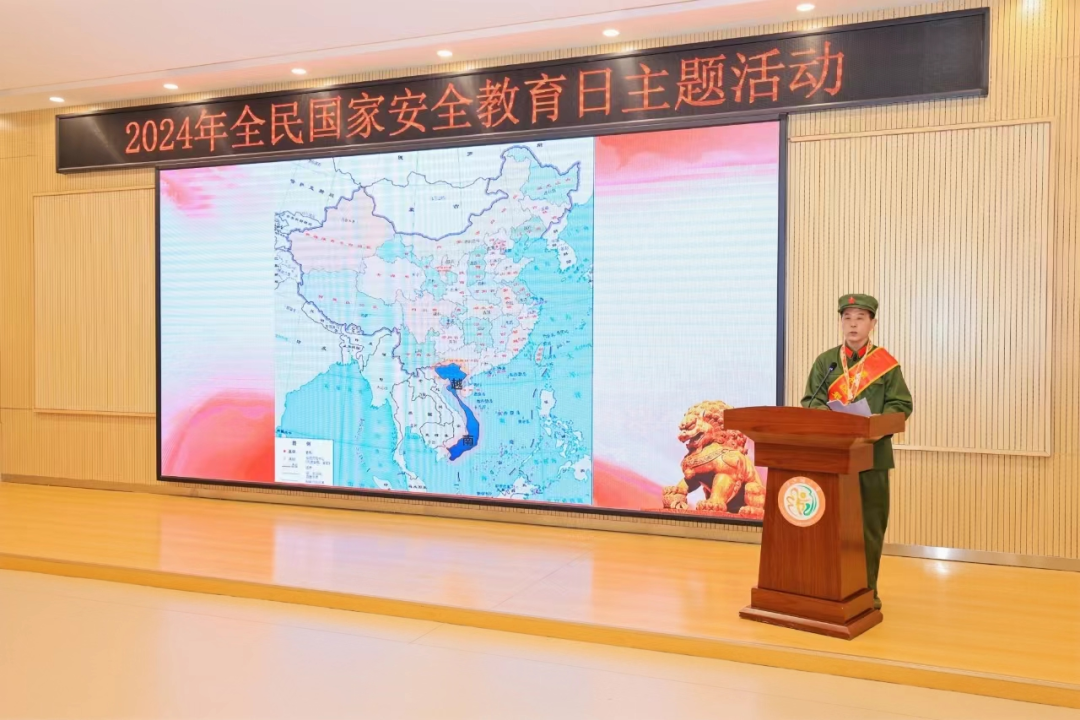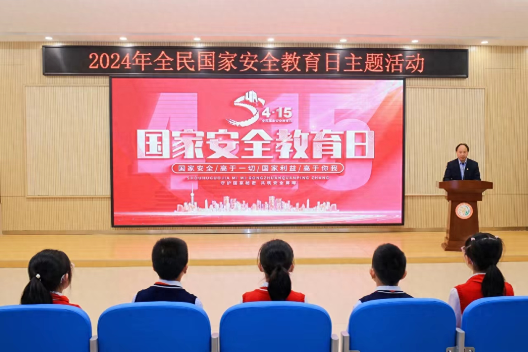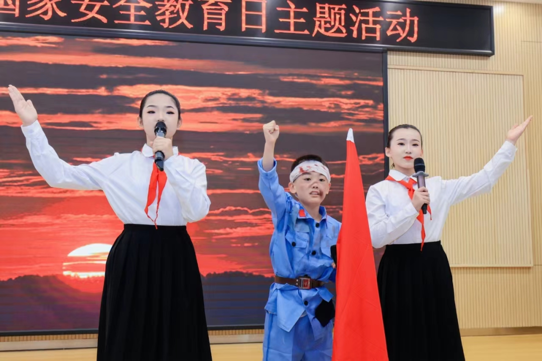 在唐晓芳校长致辞后,观看了《什么是国家安全》教育宣传片、学校自编自演的节目《日落》,使同学们了解了国家安全的意义,看到受伤红军战士,经过九次的冲锋,才英勇顽强地把鲜艳军旗插上了阵地的感人情境。教育孩子们革命斗争胜利的不易和红军战士英勇顽强、不怕流血牺牲的革命精神!让孩子们懂得“任何时候,国家利益高于一切!”