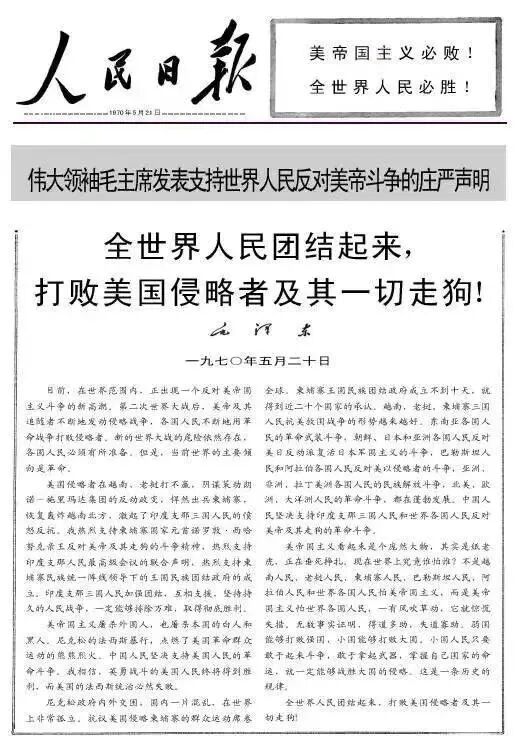 1970年5月20日,这一天下午天安门广场迎来了重大国事活动的时刻。首都各界群众五十万人在天安门广场隆重集会,支持世界人民反对美帝国主义的斗争,拥护毛泽东发表的“五·二0”声明。