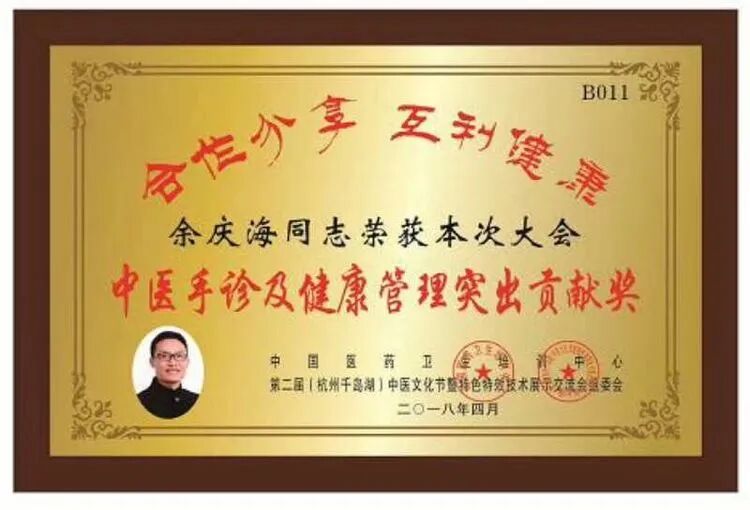 中医手诊得到了“中国医药卫生培训中心”高度肯定,余老师受邀杭州千岛湖接受颁奖,荣获“中医手诊.健康管理突出贡献奖”