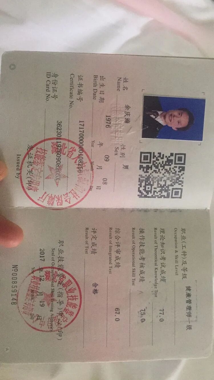 余老师2017年考取中华人民共和国“一级健康管理师”