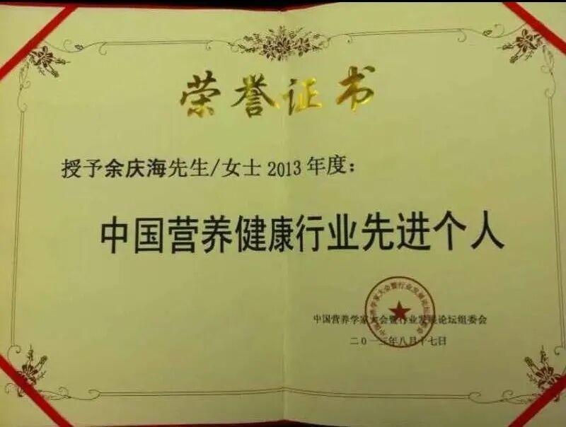 余庆海老师多次为中央领导做过健康指导,曾被前卫生部副部长接见,受邀北京大学演讲并荣获中国第二届营养学家大会“营养健康行业”先进个人,他传播营养与健康的足迹遍布美国、澳大利亚、新加坡、泰国、菲律宾、越南等全球各地。美国商会主席特邀历届海外旅游研讨贵宾,世界顶级潜能大师“安东尼罗宾未来之路”受邀贵宾,新加坡、菲律宾、越南等国家特邀健康演讲贵宾。