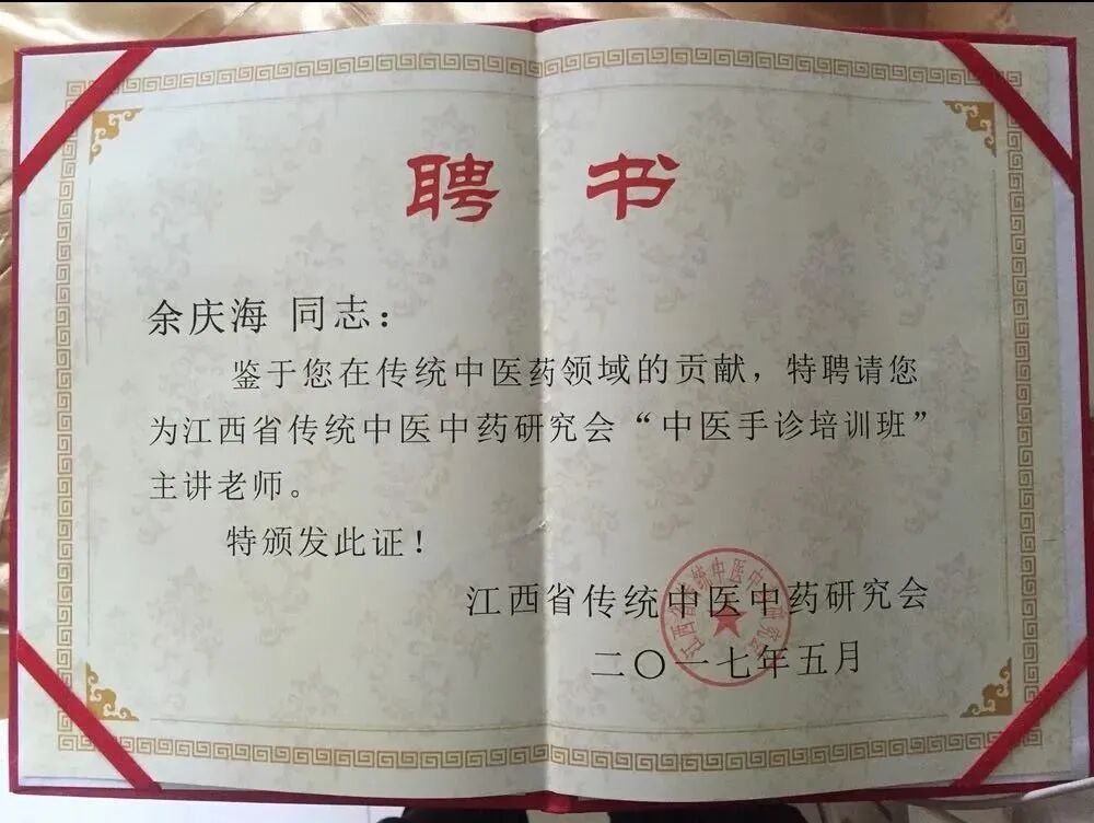 特聘江西省传统中医中药研究会“中医手诊”主讲老师