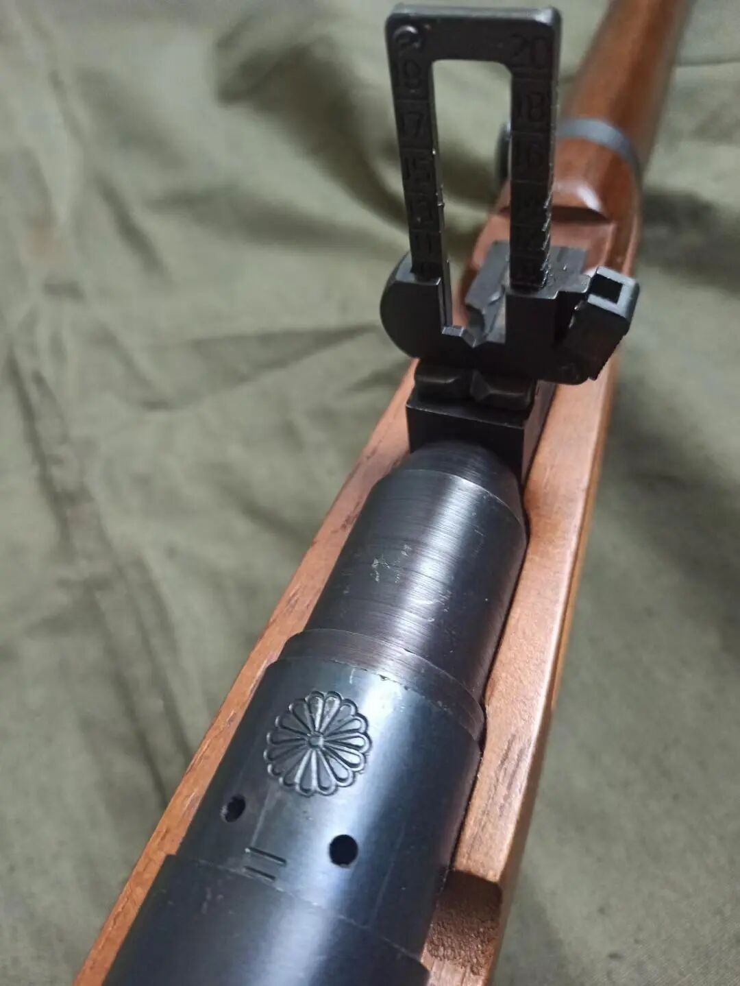 日本在生产三八步枪的通知也生产了三八式卡宾枪,也就是今天介绍的三八式骑枪,简单的说它就是三八大盖做短了一点。参数性能都一样。但是它的枪管缩短,枪托缩短,标尺射程改短,上护木盖至头箍,背带环移到了左侧。三八式骑枪全长966毫米,重量3.34公斤。除标尺射程外,(标尺射程小到2000米),因为三八大盖太长不适合这些不主要作战的部队使用。其他参数均跟三八大盖相同。三八大盖前面有一篇专门做介绍的文章,这里就不做详细介绍了。菊花标志以及三八式的日文汉字,标尺射程减小到2000米