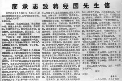 为呼吁国共两党进行和平谈判,实现祖国大陆和台湾统一,廖承志1982年7月24日往台北发电报,致信蒋经国先生。信中说:“三年以来,我党一再倡议贵我两党举行谈判,同捐前嫌,共竟祖国统一大业,惟弟一再声言‘不接触,不谈判,不妥协’,余期期以为不可。”“祖国和平统一,乃千秋功业。台湾终必回归祖国。早日解决对各方有利。台湾同胞可安居乐业,两岸各族人民可解骨肉分离之痛,在台诸前辈及大陆去台人员亦可各得其所,且有利于亚太地区局势稳定和世界和平。”“倘能于吾弟手中成此伟业,必为举国尊敬,世人推崇,功在国家,名留青史。”“至于‘以三民主义统一中国’云云,识者皆以为太不现实,未免自欺欺人。”“试为贵党计,如能依时顺势,负起历史责任,毅然和谈,达成国家统一,则两党长期共存,互相监督,共图振兴中华之大业。否则,偏安之局,焉能自保”,“和平统一纯属内政。外人巧言令色,意在图我台湾,此世人所共知者,当断不断,必受其乱。”信中最后表示:“人到高年,愈加怀旧,如弟方便,余当束装就道,前往台北探望。”此信虽为私人通信,但晓之以理,动之以情,表达了祖国大陆10亿人民盼望和平统一的愿望。