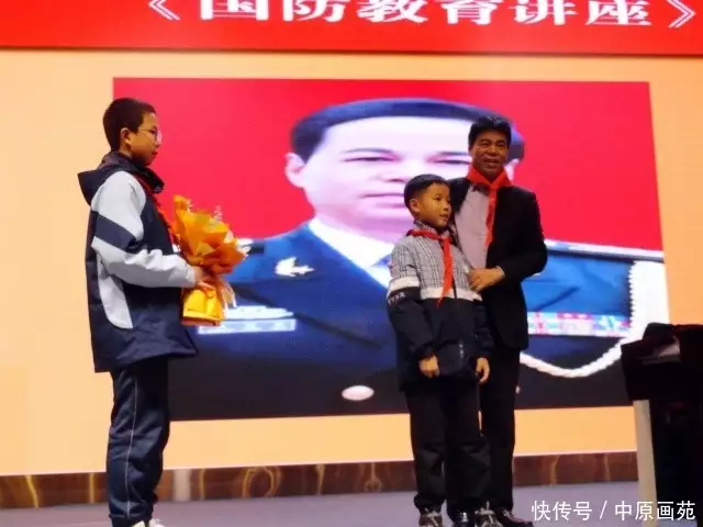 在庄宏华老司令员正式开始作报告前,友谊小学少先队员代表和华川中学学生代表,相继走上主席台,分别为敬爱的庄宏华爷爷佩戴红领巾和敬献鲜花,慈祥的庄宏华爷爷面对两个孩子,躬身致谢,温言鼓励,其情殷殷。