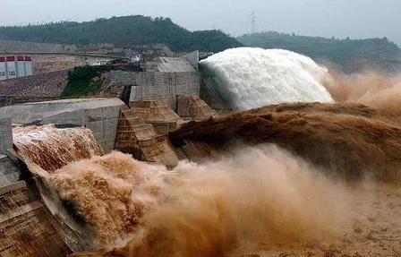 2002年7月4日,黄河首次进行调水调沙试验。这是在小浪底出水口前,泄洪明渠排出的水库上层的清水和排沙洞排出的水。