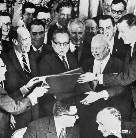 1963年8月5日,在莫斯科正式签署了《禁止在大气层、外层空间和水下进行核试验条约》。苏联领导人赫鲁晓夫、勃烈日涅夫出席了签字仪式。联合国秘书长吴丹也应邀出席了签字仪式。