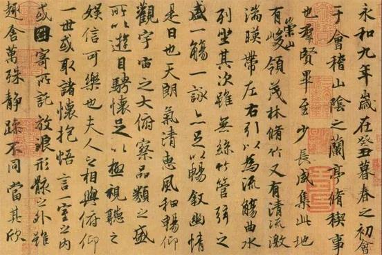 公元353年4月22日(晋永和九年三月初三日,距今已1661年)东晋谢安、王羲之等40多位著名文士在会稽山阴的兰亭雅集,饮酒赋诗。王羲之将这些诗赋辑成《兰亭集》,并挥写了一篇《兰亭集序》。唐太宗对他推崇备至,曾亲撰《晋书》中的《王羲之传论》,推颂为“尽善尽美”。还将临摹本分赐贵威近臣,并以真迹殉葬