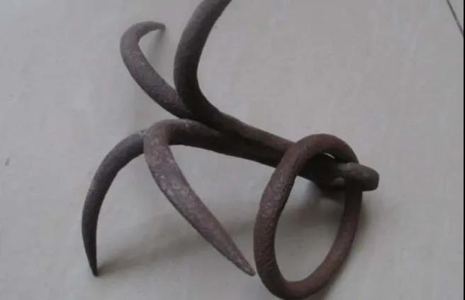飞爪是一种很厉害的暗器。爪为钢制,略似手掌,有五个钢爪,每个爪又分三节,可张可缩,其最前一节末端尖锐,犹如鸡爪。钢爪掌内装有机关,可控制各爪。钢爪尾部系有长索,与机关相连。以飞爪击人,只要将长索一抽,钢爪即猛然内缩,爪尖可深陷入肉,敌人万难摆脱。清代时,山西大盗荣康以此闻名,号称“飞爪天王”,后将此技传给天津镖局毛某。毛某艺成后,走镖时竟不插镖旗,只在镖车上悬一飞爪。群盗一见此物,即自行退避。民国以来,武林中所用飞爪已无机关,只是固定的三爪或五爪,多用于爬越高墙。