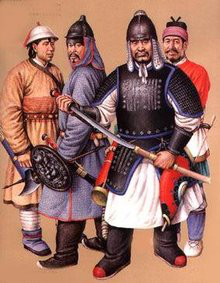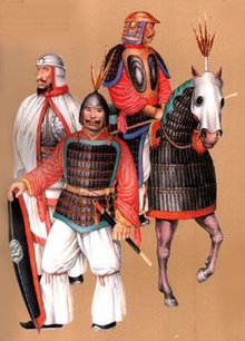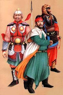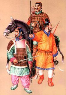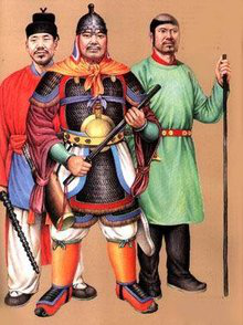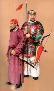 元代铠甲有柳叶甲、有铁罗圈甲等。铁罗圈甲内层用牛皮制成,外层为铁网甲,甲片相连如鱼鳞,箭不能穿透,制作极为精巧。另外还有皮甲、布面甲等。戎服只有一种本民族的服饰,即质孙服,样式为紧身窄袖的袍服,有交领和方领、长和短两种,长的至膝下,短的仅及膝。还有一种辫线袄与质孙服完全相同,只是下摆宽大、折有密裥,另在腰部缝以辫线制成的宽阔围腰,有的还钉有钮扣,俗称"辫线袄子",或称"腰线袄子"。这种服装也是元代的蒙古戎服,军队的将校和宫廷的侍卫、武士都可服用。