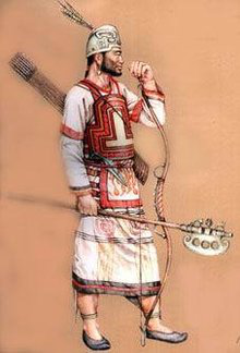 据《辽史》记载,辽在契丹国时,军队就已使用铠甲,主要采用的是唐末五代和宋的样式,以宋为主。铠甲的上部结构与宋代完全相同,只有腿裙明显比宋代的短,前后两块方形的鹘尾甲覆盖于腿裙之上,则保持了唐末五代的特点。铠甲护腹好像都用皮带吊挂在腹前,然后用腰带固定,这一点与宋代的皮甲相同,而胸前正中的大型圆护,是辽代特有的。辽代除用铁甲外也使用皮甲。契丹族的武官服装分为公服和常服两种,样式没有明显不同,都是盘领、窄袖长袍,与一般男子服饰相同,可能常服比官服略紧身一些。这两种都可作戎服。