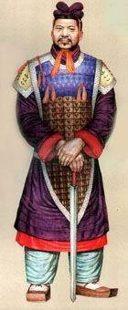 秦代将军服饰复原图这种铠甲为临阵指挥的将官所穿。胸前、背后未缀甲片,皆绘几何形彩色花纹,似以一种质地坚硬的织锦制成,也有可能用皮革做成后绘上图案。甲衣的形状,前胸下摆呈尖角形,后背下摆呈平直形,周围留有宽边,也用织锦或皮革制成,上有几何形 花纹。