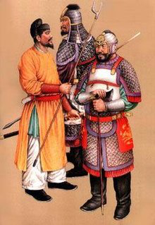 西汉时期,铁制铠甲开始普及,并逐渐成为军中主要装备,这种铁甲当时称为"玄甲"。西代戎服在整体上有很多方面与秦代相似,军队中不分尊卑都穿禅衣,下穿裤。汉代戎服的颜色为赤、绛等都属红色。汉代军队里普遍装备了"环首铁刀"。
