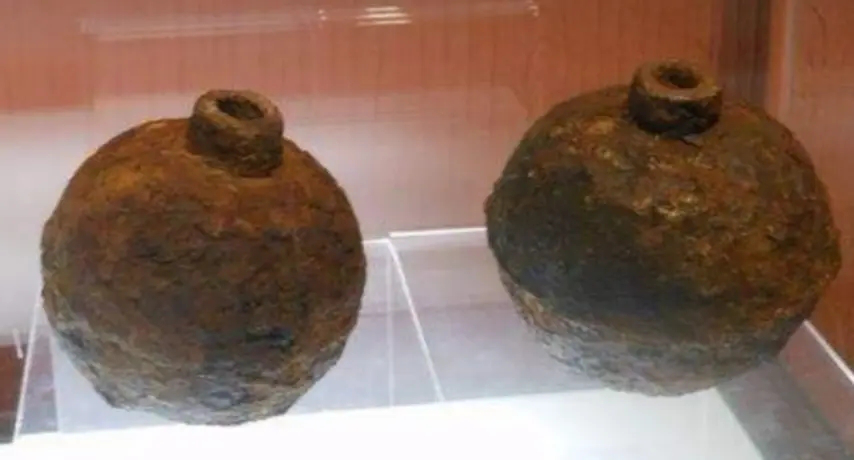 这是金军在12世纪末至13世纪初创制的铁壳火球。它的创制有一个颇有趣味的故事。据说在金大定二十九年(南宋淳熙十六年,公元1189年),在金军的占领地山西阳曲(今山西太原)北郑村,有个捕狐人铁李,在一个口小腹大的陶罐内装填许多火药,通火线于外,尔后把火药罐放在群狐出没之处,待狐狸接近时,即点爆火药罐,群狐受惊后纷纷乱逃,结果投入铁李预设的罗网中。铁李持斧将它们砍死,满载而归。金军受此启发后,创制了铁壳爆炸性火球,用于作战之中。南宋嘉定十四年(公元1221年),金军携铁火炮进攻蕲州(今湖北蕲春)。蕲州郡守李诚之和司理赵与?率部坚守。攻城时,金军在城外环列抛石机,向城内抛击铁火炮;打到城顶上时,守城宋军中炮即死,有的士兵的头部和面庞都被削去一半;击中城楼时,城楼即被摧毁;打到居民住户时,居民伤亡甚多。经过25天的围攻,金军占领了蕲州。李诚之全家及僚佐全部死难,赵与□全家15人也亡于战祸,他本人仅以身免,事后作《辛巳泣蕲录》,记载了这次战祸。