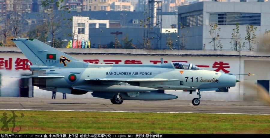 歼-7MB型是在歼-7M型基础上出口孟加拉的机型,基本上跟歼-7M型相如,但使用涡喷7C型发动机。1989年4月签订14架购机合同,同年10月交机。后来孟加拉空军又购买了9架歼教7BB型。2006年孟加拉空军再次购买12架以歼-7MG型型成基础的歼-7BG型和4架歼教7BG型,以填补把MiG-29卖掉后的战力空隙。