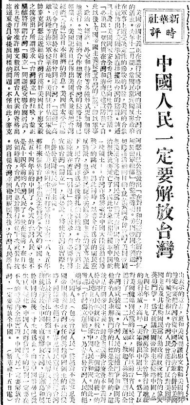 中国人民(包括台湾人民)将绝对不能容忍美国帝国主义对台湾或任何其他中国领土的非法侵犯,同样地亦绝对不能容忍国民党反动派把台湾作为最后挣扎的根据地。中国人民解放斗争的任务就是解放全中国,直到解放台湾、海南岛和属于中国的最后—寸土地为止。由于中国形势已发生巨大变化,中国人民解放斗争的胜利一定要在不久的时间内全部实现。中国人民一定要解放台湾,一定要解放全中国。