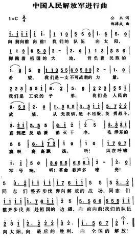 《中国人民解放军军歌 》,原名《八路军进行曲》,为《八路军大合唱》中的一首齐唱歌曲。公木词,郑律成曲,1939年秋作于延安。同年冬,由曲作者亲自指挥,鲁迅艺术学院合唱队与乐队在延安中央大礼堂首次演出。1940年夏,刊登于《八路军军政杂志》,随即在各抗日根据地广泛流传,深受广大军民的欢迎。