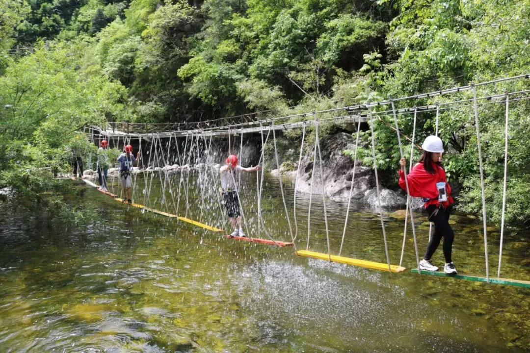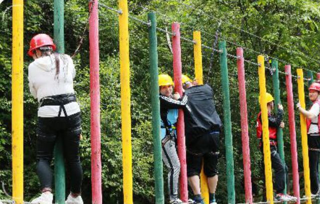 大脚丫、滑索过河、悠悠桥、浮桩桥、玻璃天桥、凌空漫步、独木桥、悬空栈道、抽板过河、携手并进等17项趣味挑战。